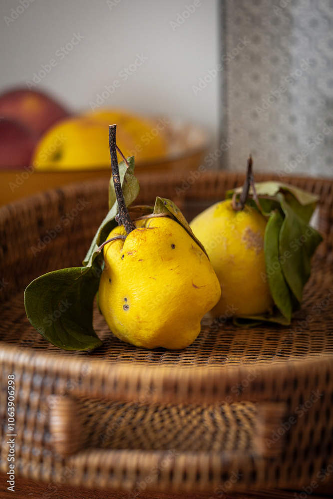 Coing et autres fruits dans un panier en osier dans la cuisine.