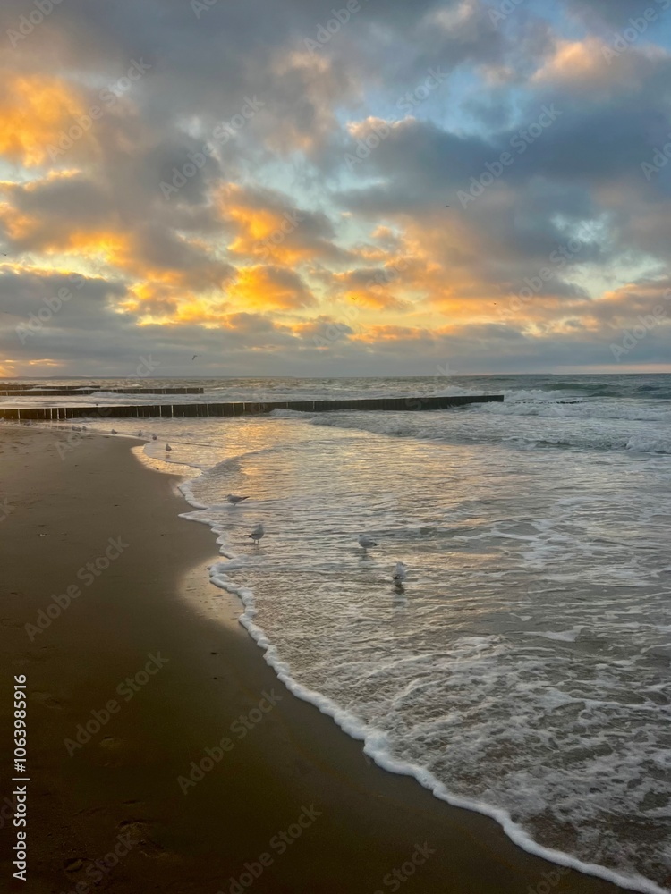 Tender purple clouds reflection at the seashore, beautiful sunset seascape, empty sea beach, fantastic clouds reflection on the sea surface