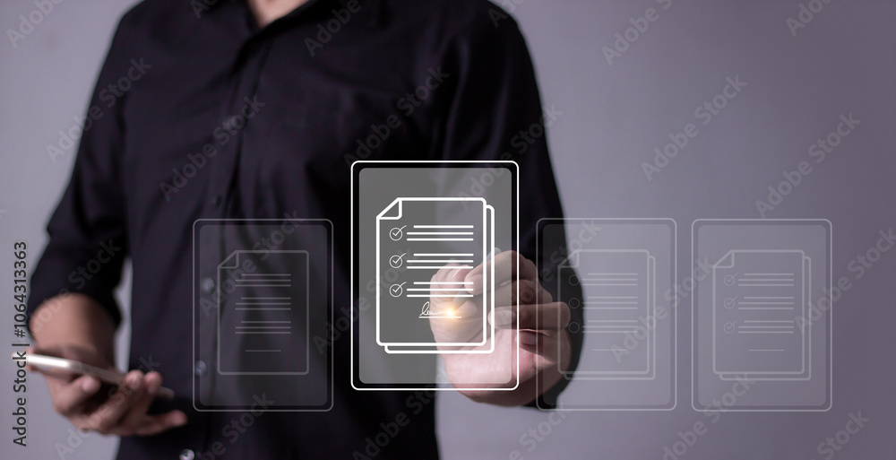 Young man with smartphone mobile hand holding a pen touching to sign a business contract online, Electronic signature, Digital documents, Future business contract signing, Online business contract