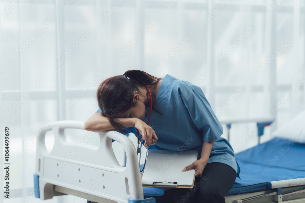 Exhausted Nurse: A compassionate nurse leans heavily on a hospital bed, exhaustion etched on her face, clutching patient charts. The image speaks volumes about the emotional toll of healthcare.