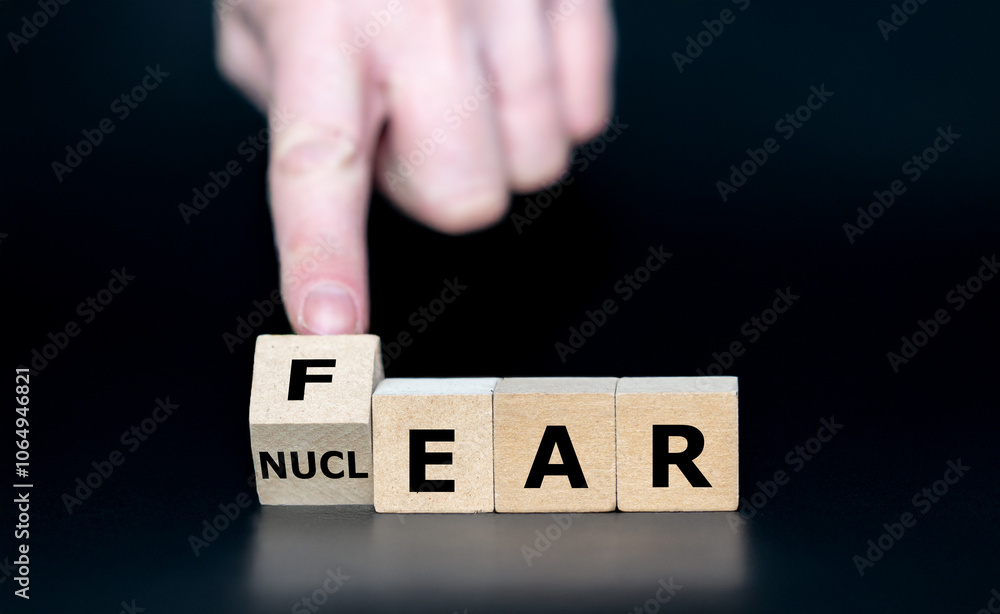 Cubes form the words 'nuclear' and 'fear'. Symbol for the fear of nuclear waste, nuclear energy and nuclear weapons.