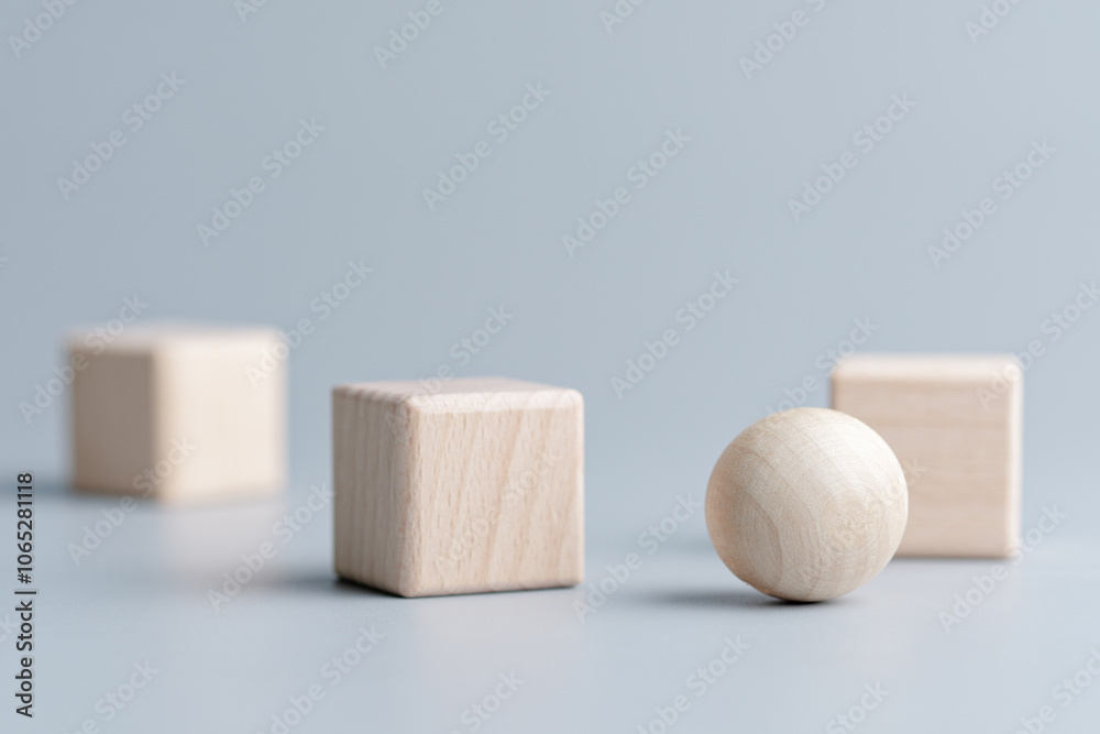 A round wooden ball in a group of wooden cubes, comparison of fixed and moveable things, easy movement, and simplicity ideas