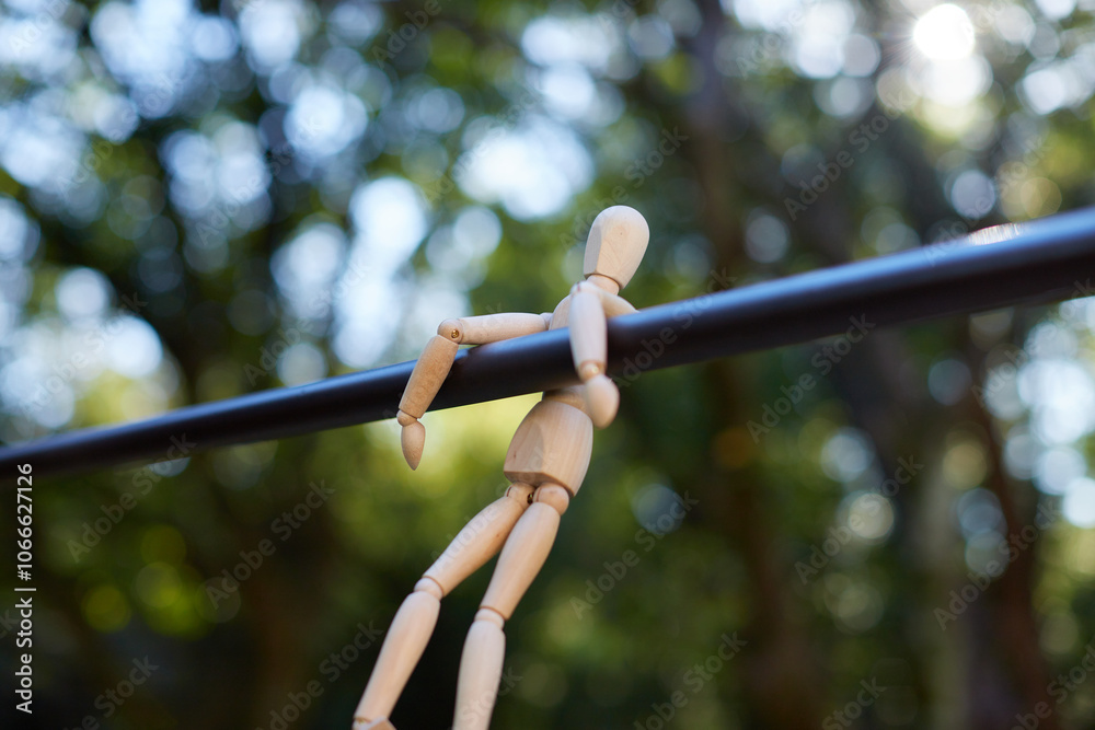 秋の公園の鉄棒を使って遊んでいる可愛いマネキン人形の様子