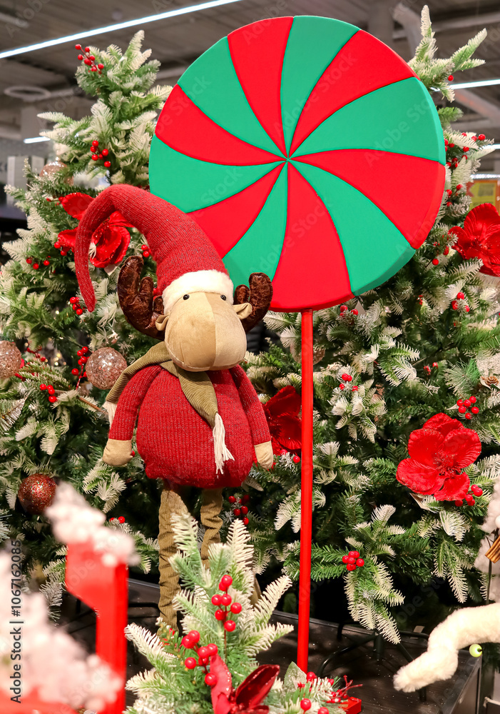 Christmas decorations with a large candy lollipop and a reindeer in a red Santa hat and sweater against a background of Christmas trees decorated with berries, poinsettia flowers and baubles