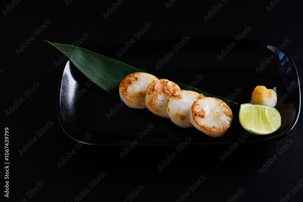 Grilled Japanese scallop grilled scallops Japanese Seafood Hokkaido japan Isolate in black background