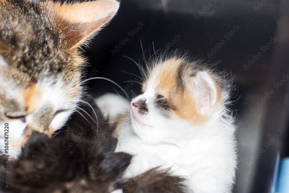 A cat and a small kitten are gazing into each others eyes with curiosity