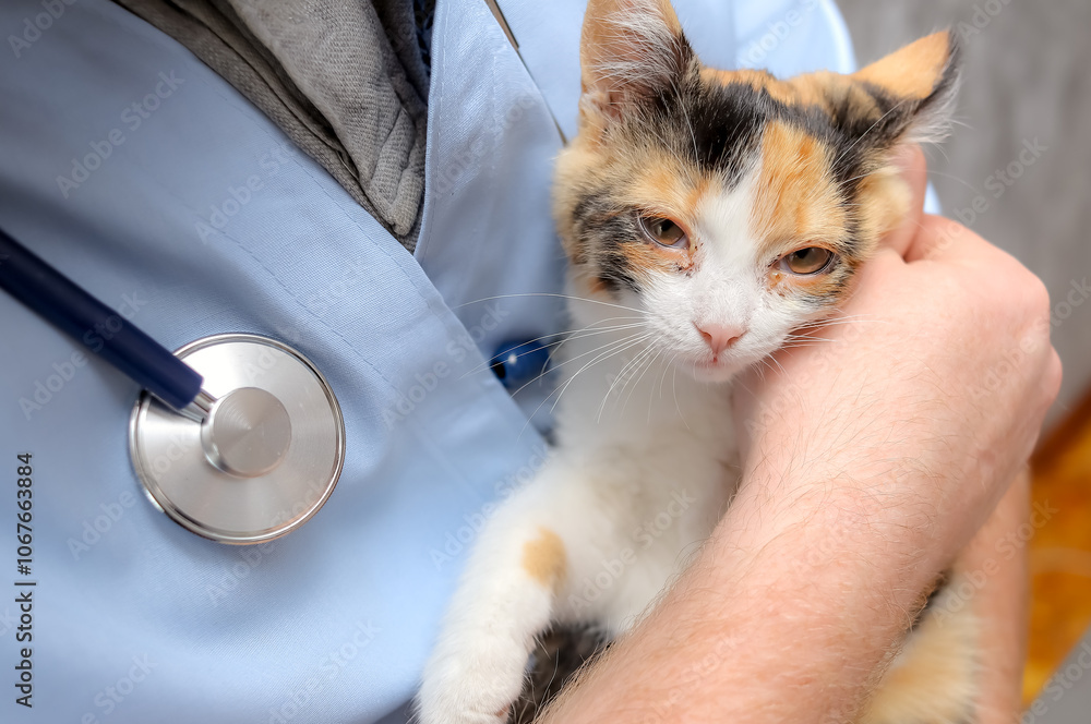 veterinarian holds kitten with half-closed infected eyes with pus. pet eye diseases, medical examination, veterinary clinic concept.
