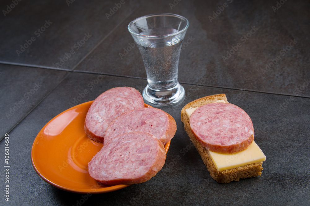 sandwich with salami and cheese, a glass of vodka on dark stone background