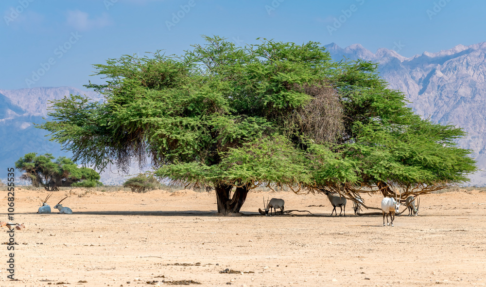 Under acacia tree are resting Antelope Arabian white oryx (Oryx dammah), it inhabits native environments of Sahara desert, recently introduced into nature reserves of the Middle East