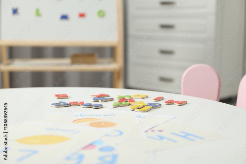 Learning alphabet. Different magnetic letters and pictures on white table indoors