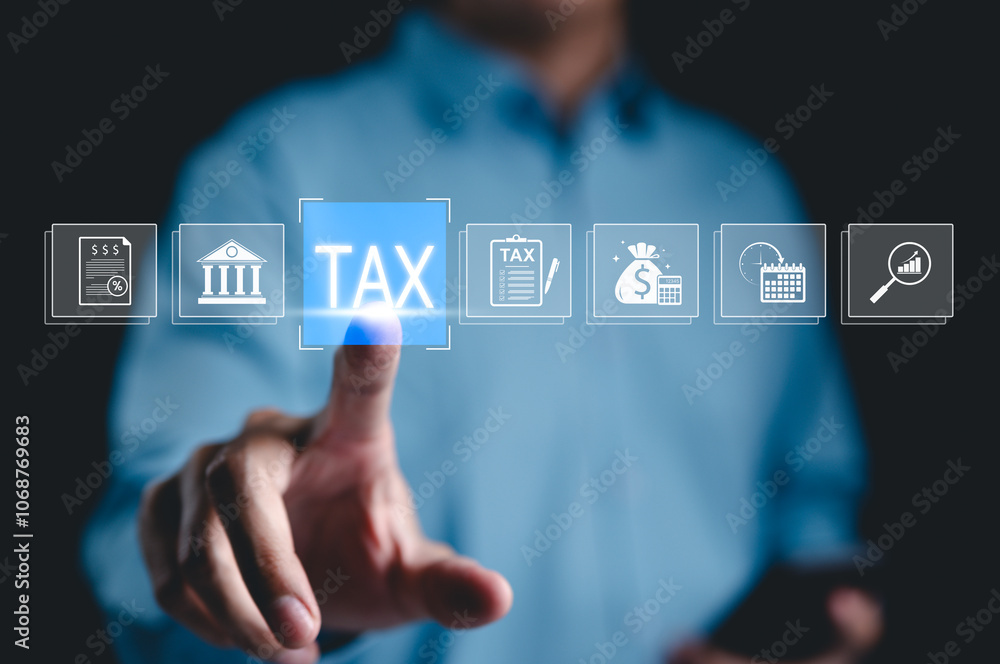 Tax Management and Government Taxation Concept. Person interact with tax interface, icon related to tax filing, government institutions, financial planning, payment deadlines, efficient tax management