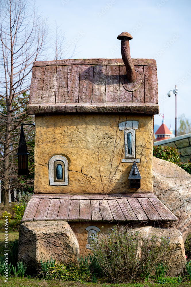 house with a blue roof and a lamp on the roof