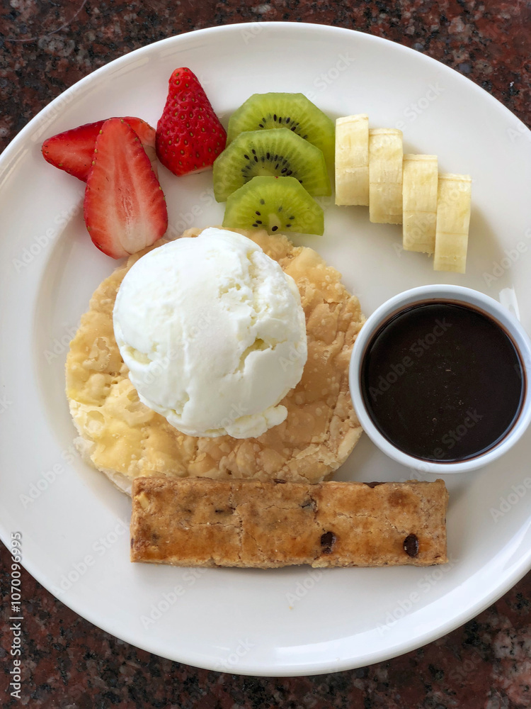 Coconut sorbet with biscuit, chocolate sauce and fresh fruits on a plate