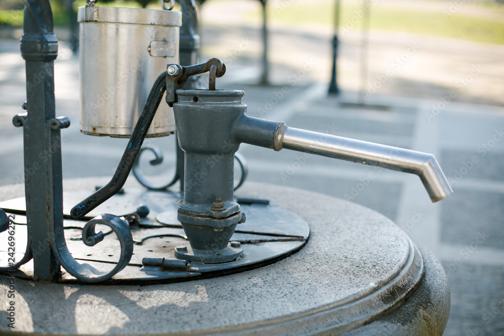 An electrician in work clothes changes street lamps while standing on a high platform.