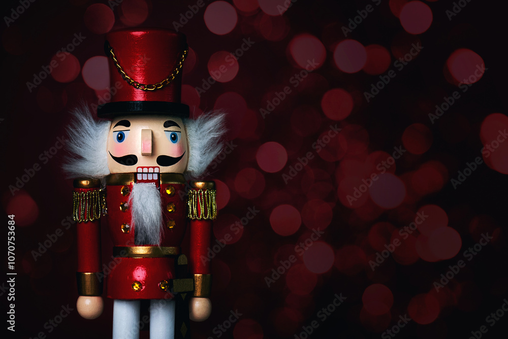 Close up of christmas wooden nutcracker toy soldier with christmas lights and space for text. Christmas concept background