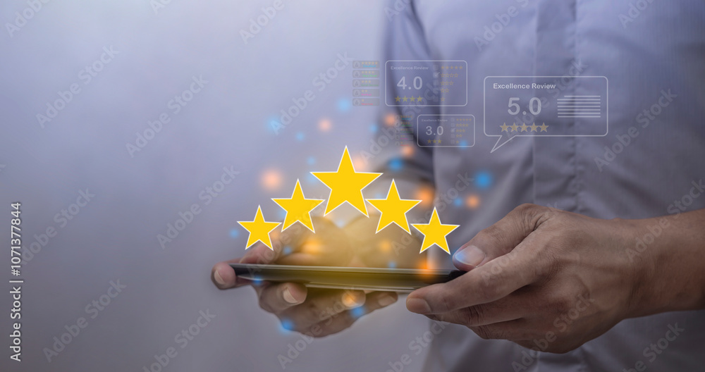 Review Excellence, Young Man hand holding Laptop with five star to review and give 5 stars with very good results in service, Good review 5 star rating choice feedback
