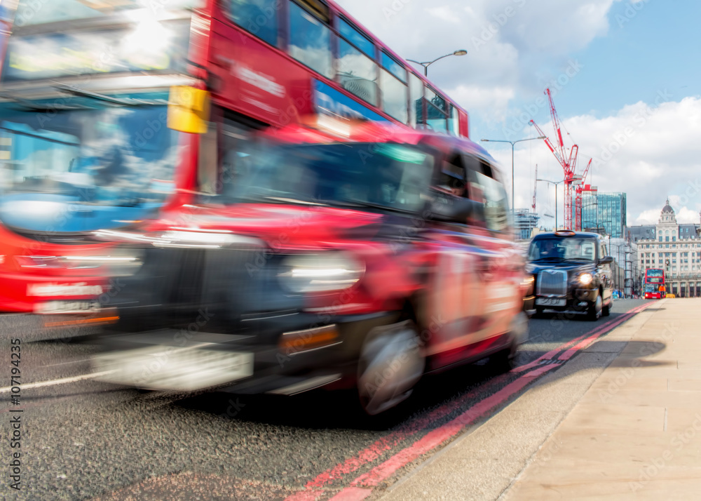 London Transport Concept. Red Bus And Black Taxi Cab Motion Blur