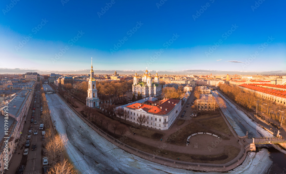 Aerial top view to St. Nicholas Naval Sea Cathedral. Panorama of evening historical city center - Semimostye. Orthodox church located on banks of Kryukov and Griboyedov canal. Saint Petersburg. Russia