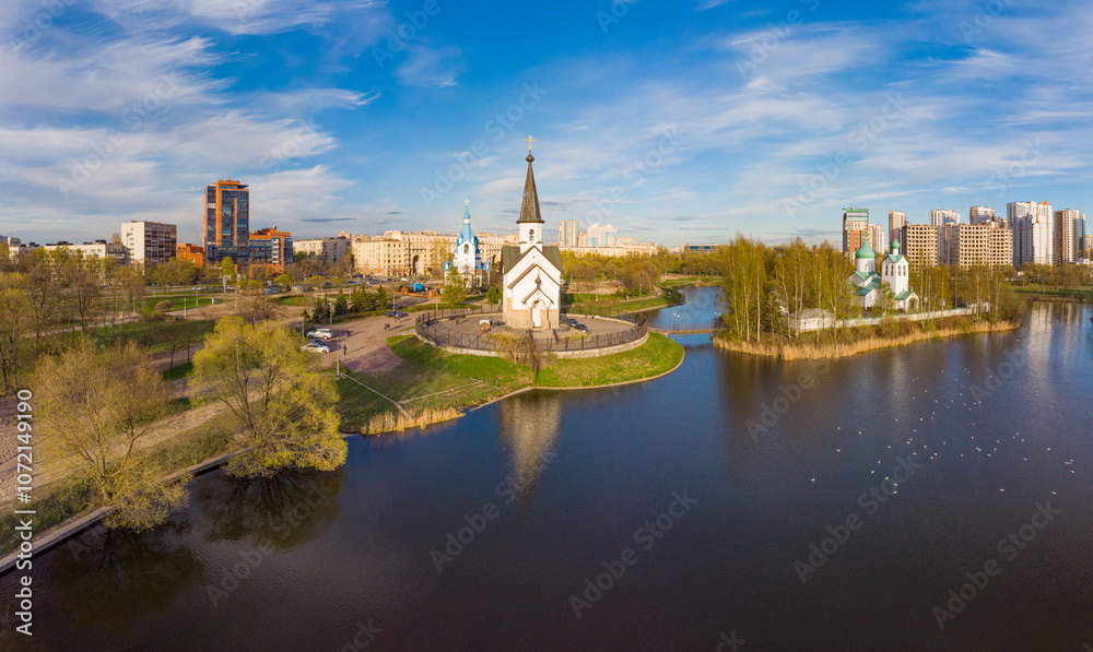 Aerial top View to St. George the Victorious Georgievskaya, Sergius Of Radonezh and Church Nativity of Christ and Srednerogatsky pond. Pulkovsky park. Saint Petersburg. Russia. Europe