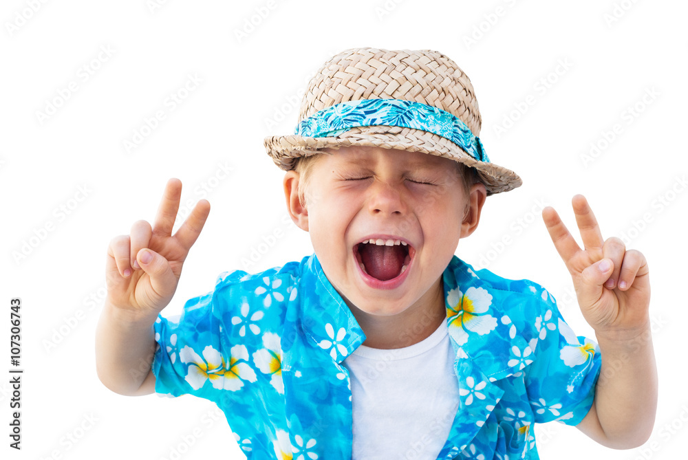 Child Straw Hat Laughs Camera Isolated White
