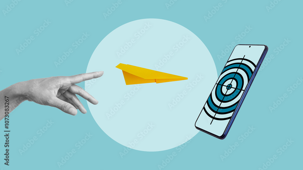 Mobile marketing and targeting is shown by smartphone with dartboard in the screen. Target audience concept and digital marketing