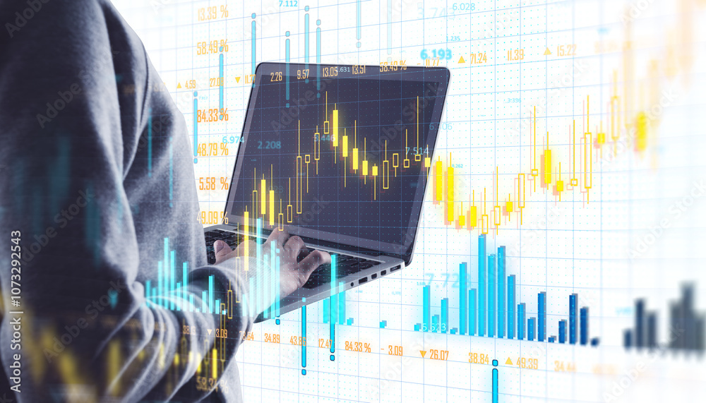A person using a laptop with financial stock market data displayed on the screen, with graph charts overlayed, on a light background. Business concept. 3D Rendering.