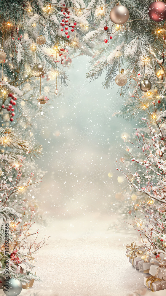 A warm Christmas background. Dreamy winter pathway surrounded by snowy, decorated trees and festive lights. Perfect for Christmas invitations, seasonal promotions, or magical holiday-themed designs