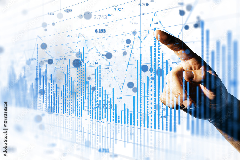 Hand pointing at a digital graph with fluctuating blue lines and data points. Transparent background. Concept of financial technology