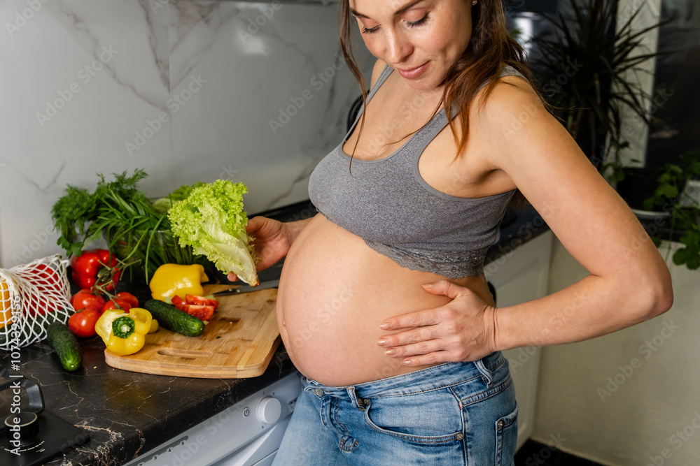 Happy pregnant woman cooking at home, doing fresh green salad