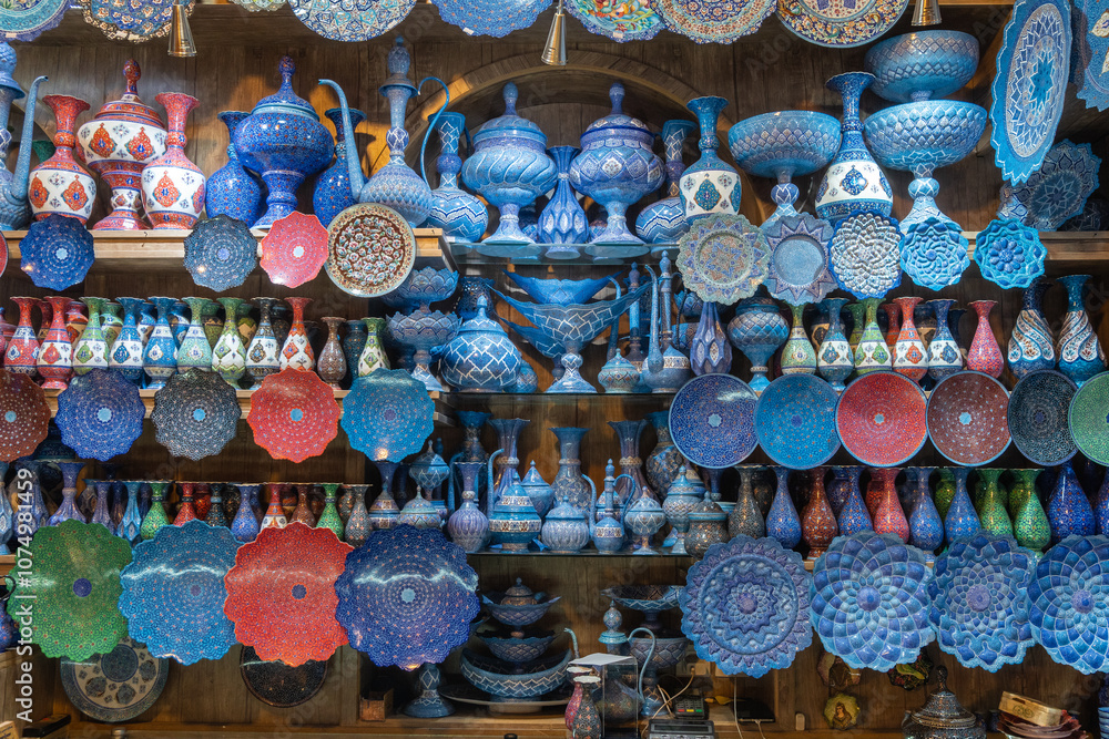 A shelf filled with colorful plates and vases of various shapes, Shiraz, Iran