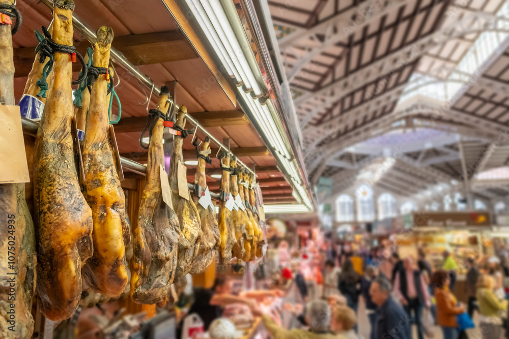 Traditional Jamon meat shop in Central Market of Valencia, Spain
