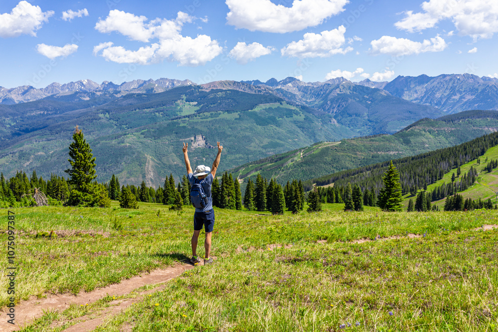 Vail summer in ski resort with hiking trail and man with arms raised in Colorado with mountain peaks and mount of the holy cross in wilderness