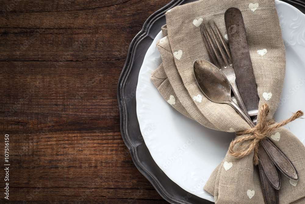 Vintage silverware on a plate against rustic wooden background. Concept of dinner or party