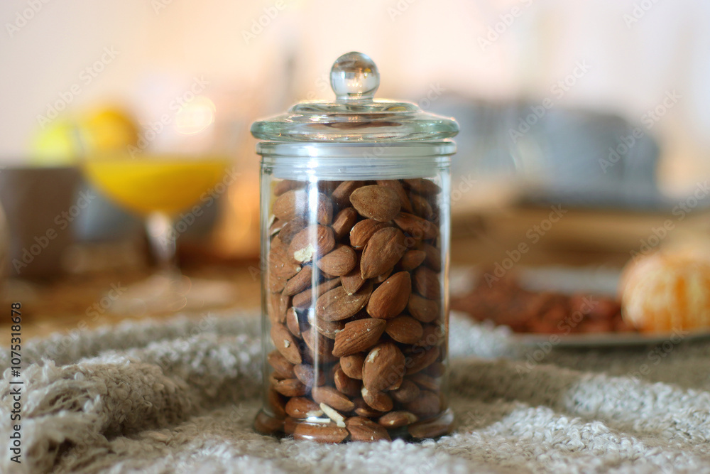 Books, e-reader, tea, orange juice, fruit, snacks, yarn, blanket and lit candles on the table. Autumn or winter hygge at home. Selective focus.