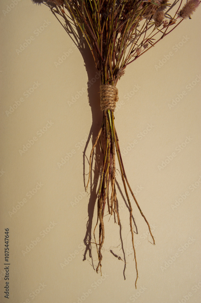 One bouquet of wild flowers tied with a ribbon on a light background.