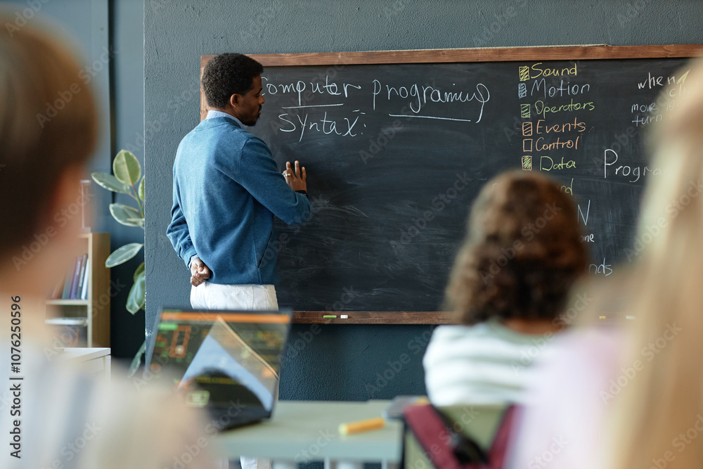 Back view of African American male teacher writing on blackboard in school classroom and explaining IT programming to children copy space