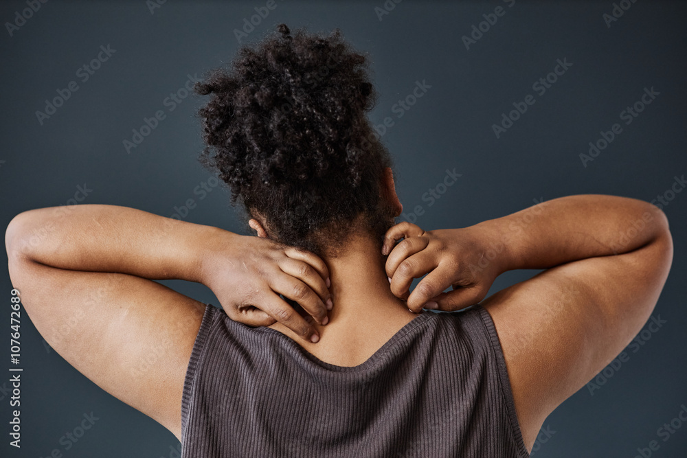 Back view of African American woman scratching neck on minimal studio background, copy space