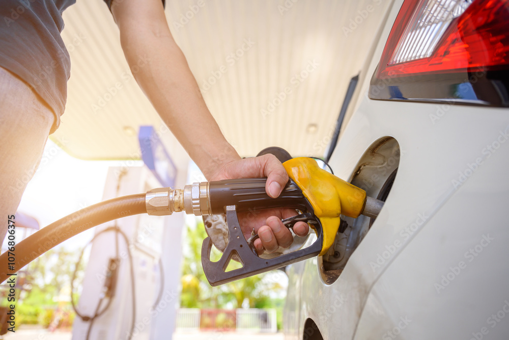 A close-up of a person using a yellow fuel nozzle to fill up their car at a gas station. of energy-related projects, the fuel industry, daily convenience, and transportation