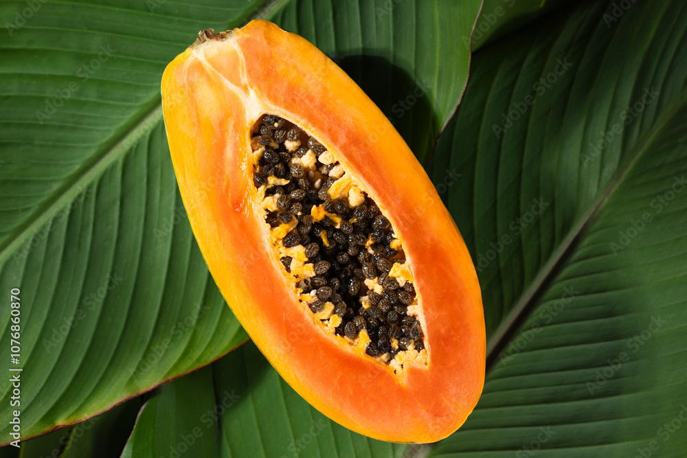 Cut half of fresh papaya fruit with vivid colors. Papaya fruit is ideal for themes of natural health and tropical lifestyle. Papaya fruit is highly used in cosmetics and beauty procedures.