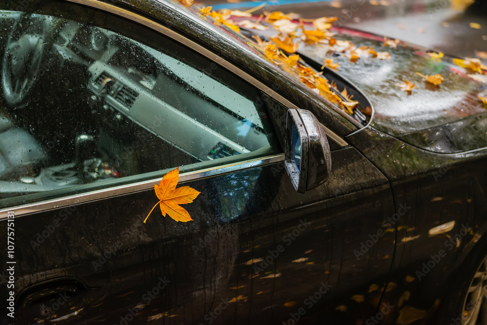 Side view of a black car with autumn leaves on the windshield and window during rainy day