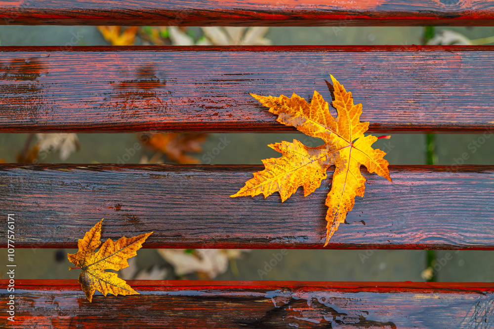 Scenic fallen yellow leaf on brown wooden bench in the city park