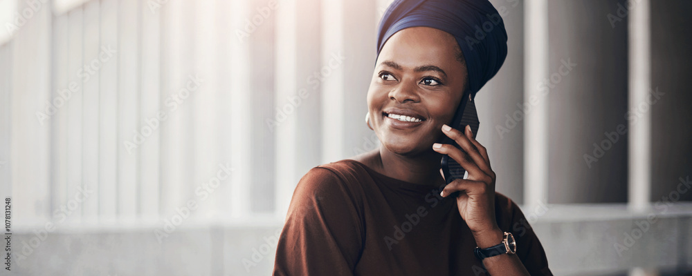 Business, black woman and happy on phone call for communication and networking. Female person, employee and smile or satisfied with good news on discussion, conversation and contact at workplace