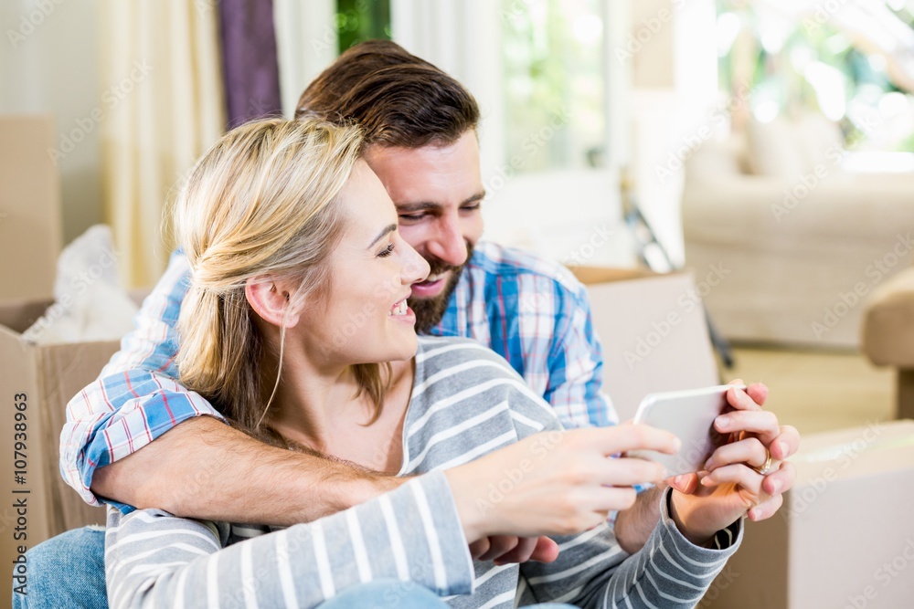 Couple using mobile phone in living room