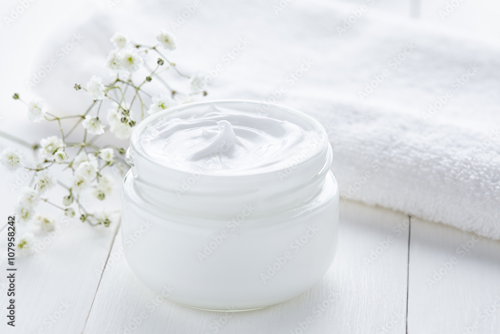 Natural facial cream healthy organic cosmetic product wellness and relaxation makeup mask in glass jar with towel on white background