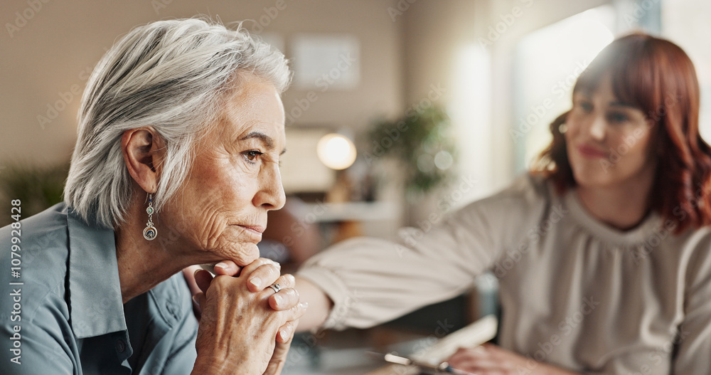 Psychologist, talking and senior woman with support and mental health assessment in consultation. Sad, empathy and care with counseling, psychology and evaluation with advice in office for help