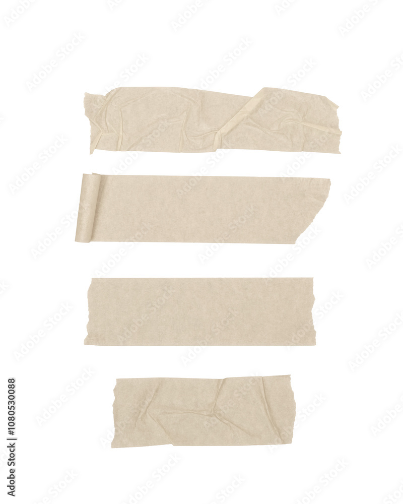 Different textures of beige tape on a white background. Straight cut tape. A cut piece of tape