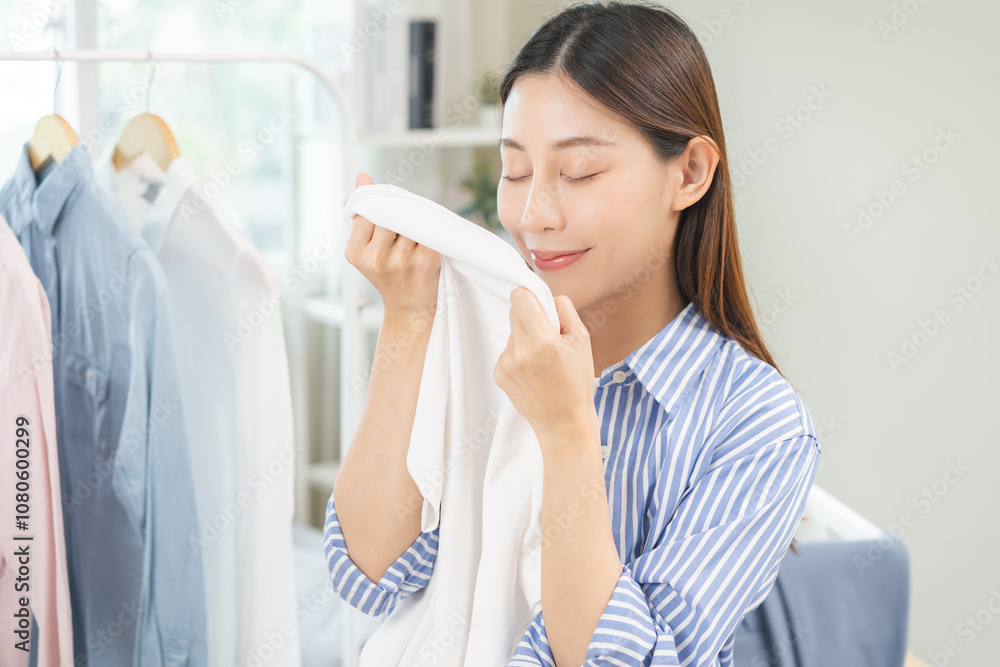 Feel softness, hygiene. Smile asian young woman touching fluffy white shirt smelling fresh clean clothes, pretty girl comfort sniff after washing laundry. Household work at home, chore of maid concept