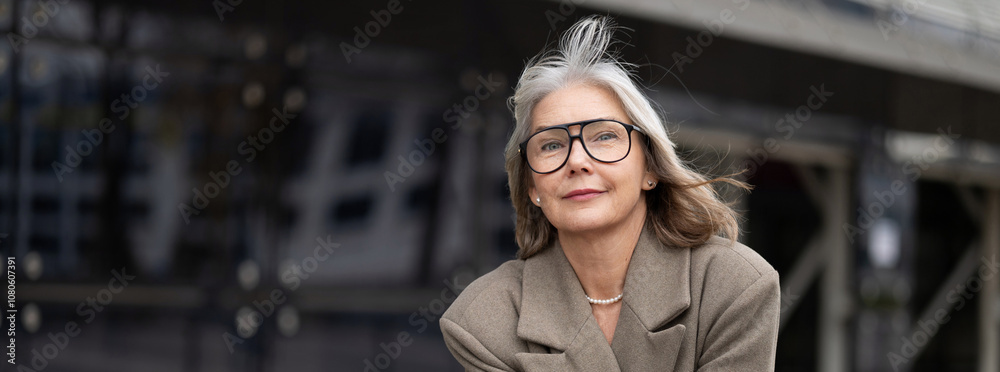 A senior businesswoman stands confidently outside a modern office building on a sunny day, showcasing her professional elegance and experience