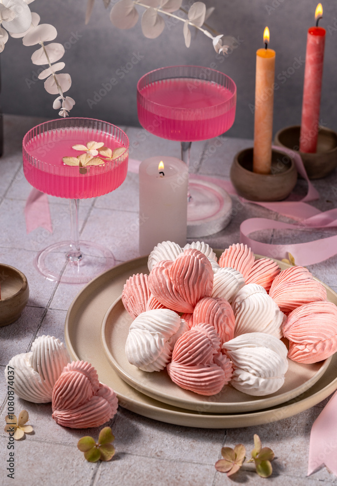 Pink and white heart-shaped meringues decorating a romantic table setting