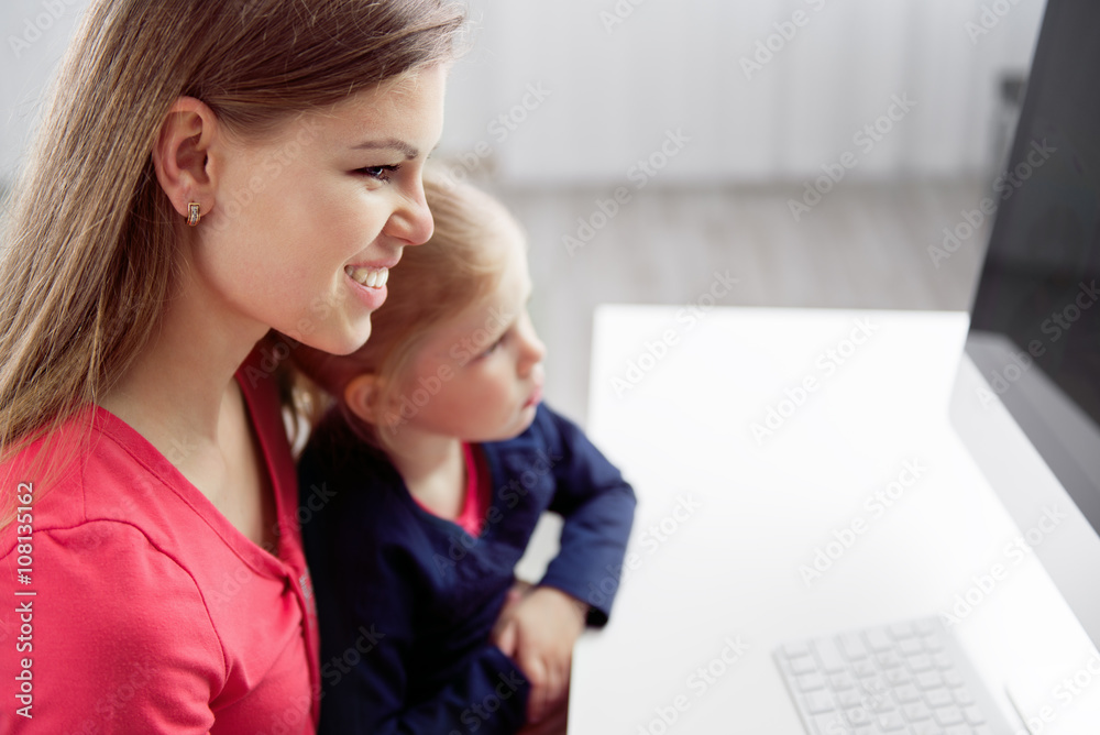 Young family browsing internet sitting at the desk in home office. Concept of networking and communication.